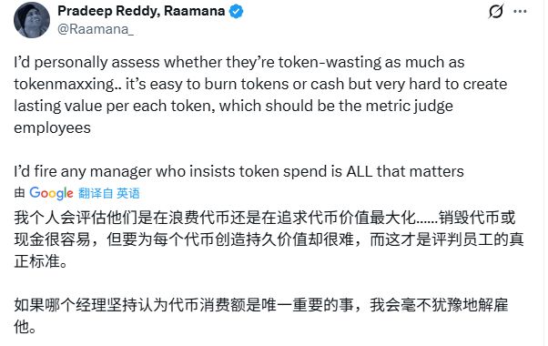 一位网友分享了他的评估标准,评价一个AI项目的价值,看的不是消耗了多少Token,而是每个Token创造了多少持久的价值。如果哪个管理者坚持以Token消费额为唯一考核标准,他会毫不犹豫地选择离开。