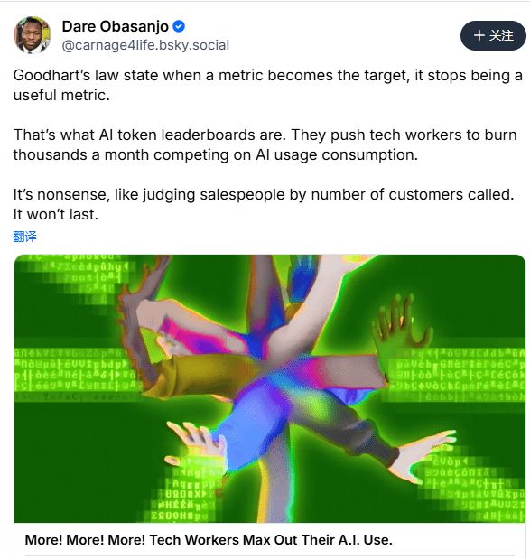 有评论引用古德哈特定律来剖析这一现象,当一个指标本身成为目标时,它就不再是一个好指标。Token排行榜正是如此,它驱使员工去攀比消耗量,而非追求真正的成果。