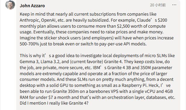 还有人开始探索让AI更加节俭、更加自主,比如用更小规模的模型来完成特定任务。IBM的Granite 4系列模型,其3B和350M参数版本运行成本仅为大型模型的一小部分,甚至可以在树莓派等低功耗设备上运行。