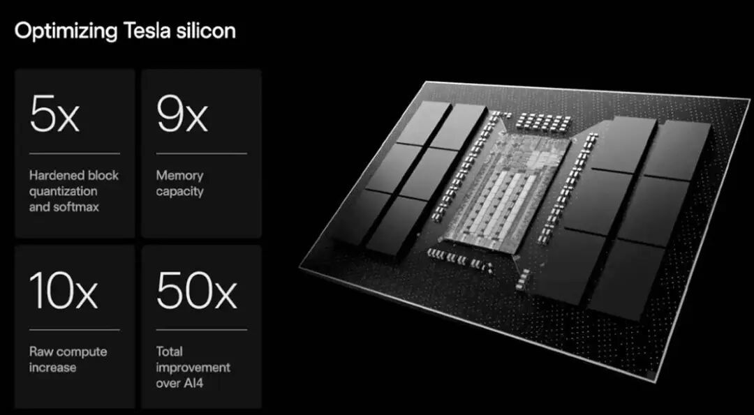 特斯拉AI 芯片效能提升:相较AI4,硬化区块量化与softmax 功能提升5 倍、存储容量增加9 倍、原始运算能力提升10 倍、总体效能提升50 倍。