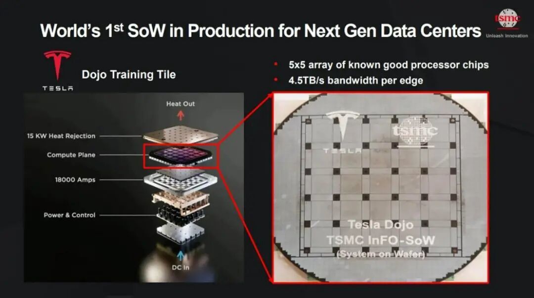特斯拉Dojo 训练芯片:全球首款量产System on Wafer (SoW) AI 处理器,采用TSMC InFO 技术,5×5 已知良品芯片阵列,每边频宽4.5 TB/s,支援15 kW 散热与18,000 A 电流输入。