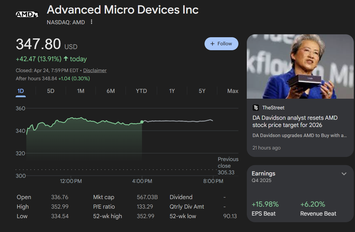 对AMD来说,他们还有个独特的优势,那就是同时拥有高性能CPU及GPU两大核心业务,之前NVIDIA的GPU被吹捧时,AMD被看作GPU第二大供应商,股价也跟着坐火箭了。