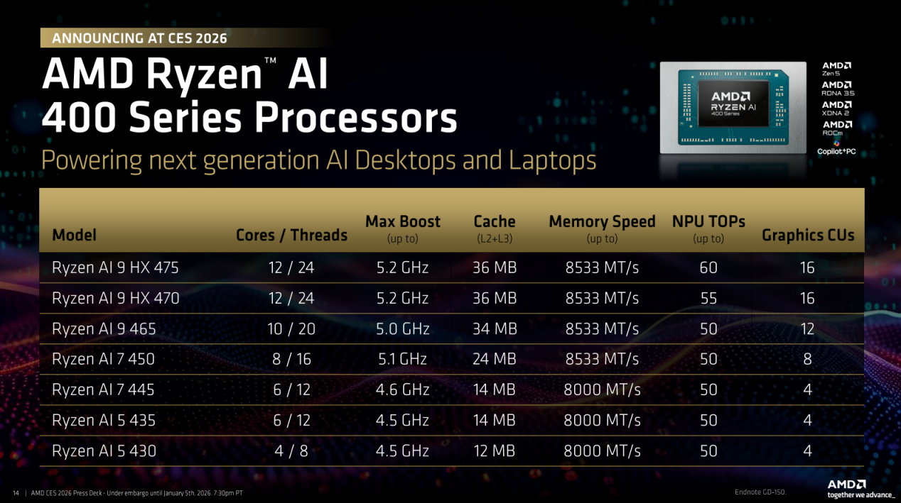 基本上各大厂商都会发布搭载AMD锐龙AI 400系列的产品,将于今年一季度陆续上市。
