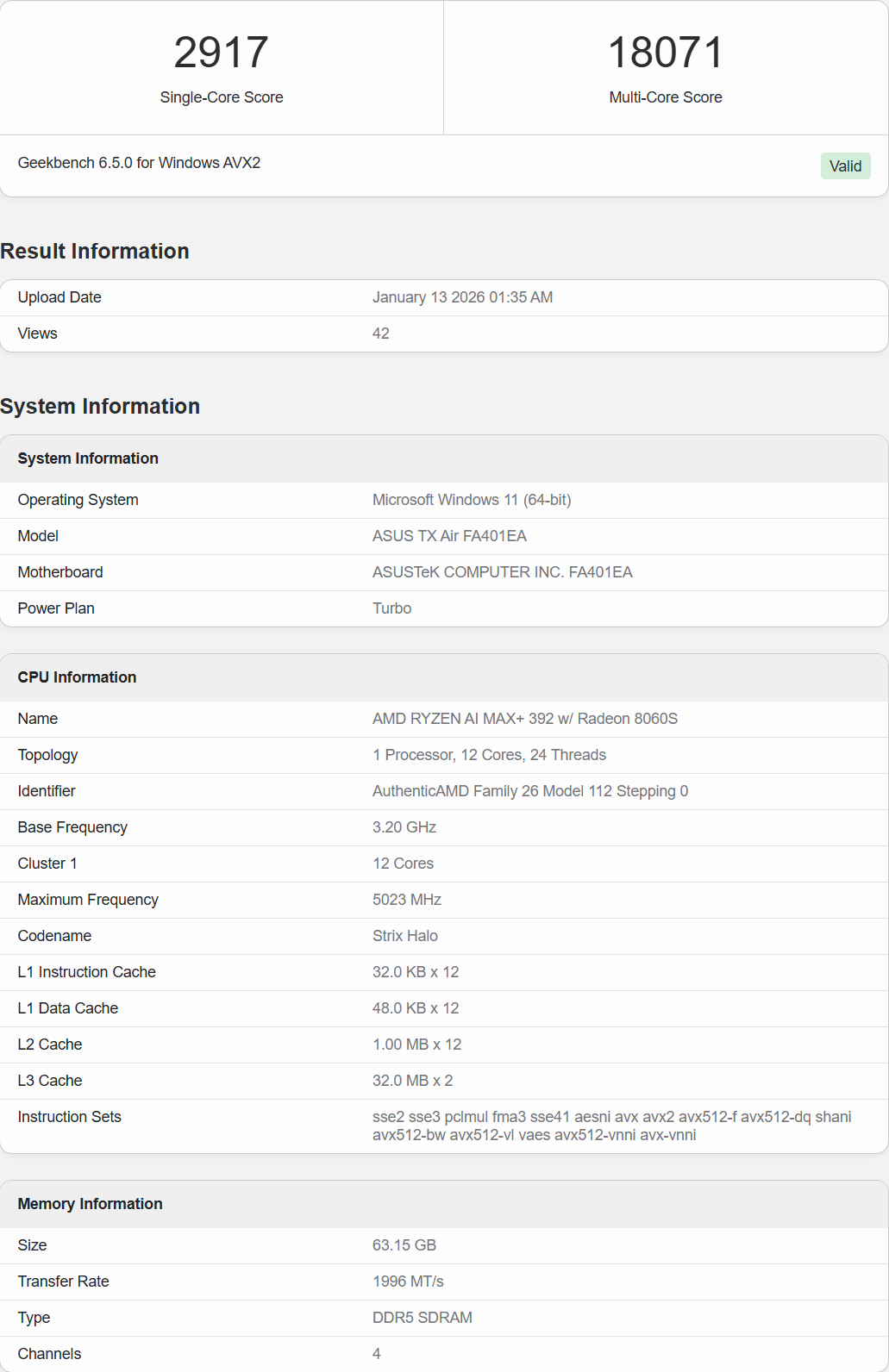 本次泄露的跑分来自华硕TX Air FA401EA笔记本,配备了64 GB LP5X内存,运行速度为8000MT/s,芯片运行频率略高于5.0GHz。