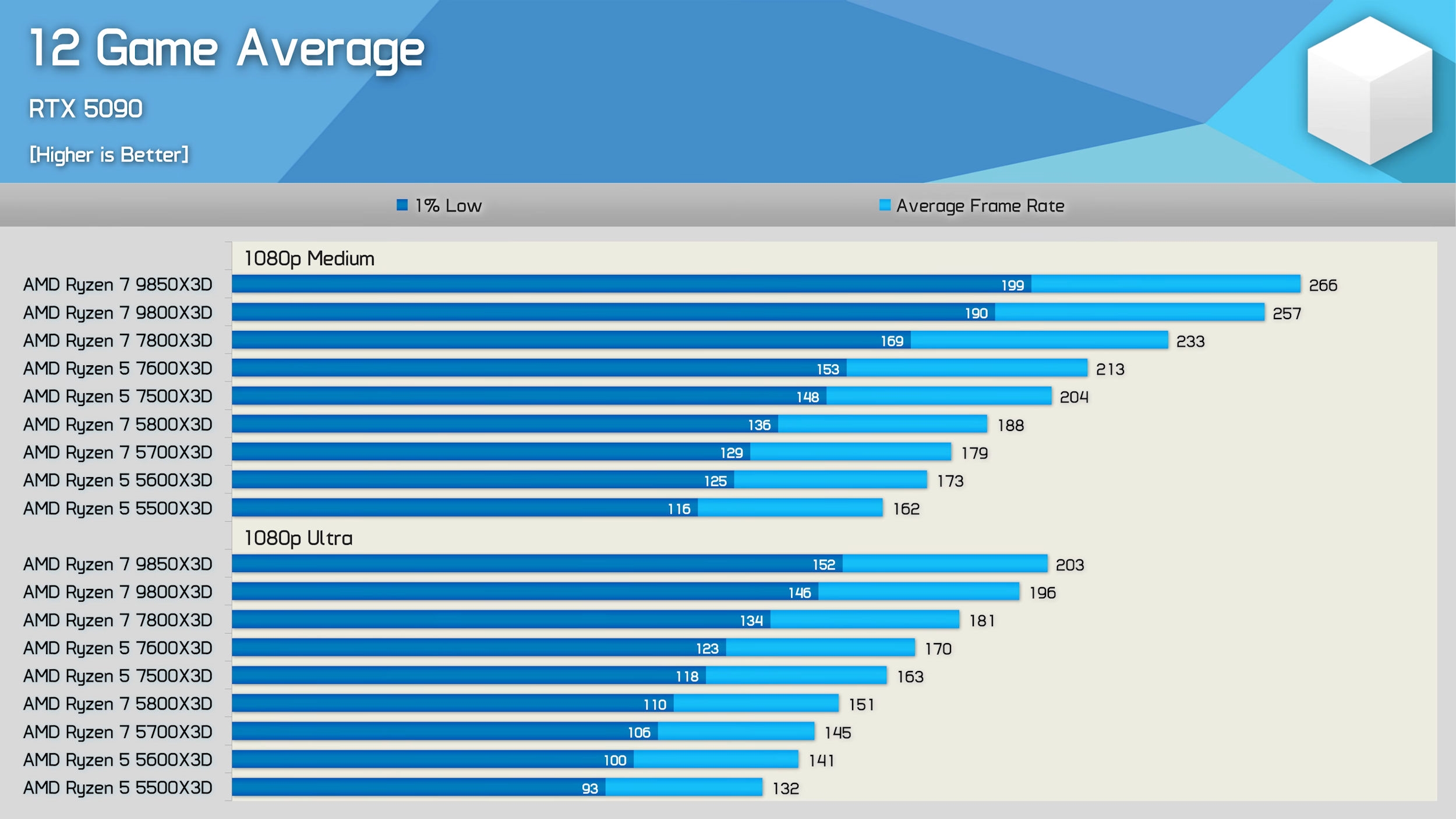 在1080p中画质下,锐龙7 9850X3D以平均266 FPS、199 FPS的1%低帧成绩领跑全场,锐龙7 9800X3D紧随其后为257 FPS,锐龙7 7800X3D为233 FPS。