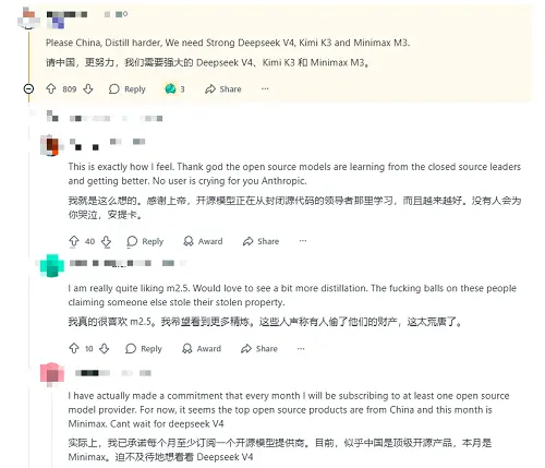 由于Anthropic的模型是闭源的,而三家中国AI公司的模型基本是开源的,因此甚至有网友认为,就算蒸馏行为的确存在,他们也支持这种行为,因为业界需要更强的Deepseek V4, Kimi K3和Minimax M3,没有用户会为Anthropic哭泣。