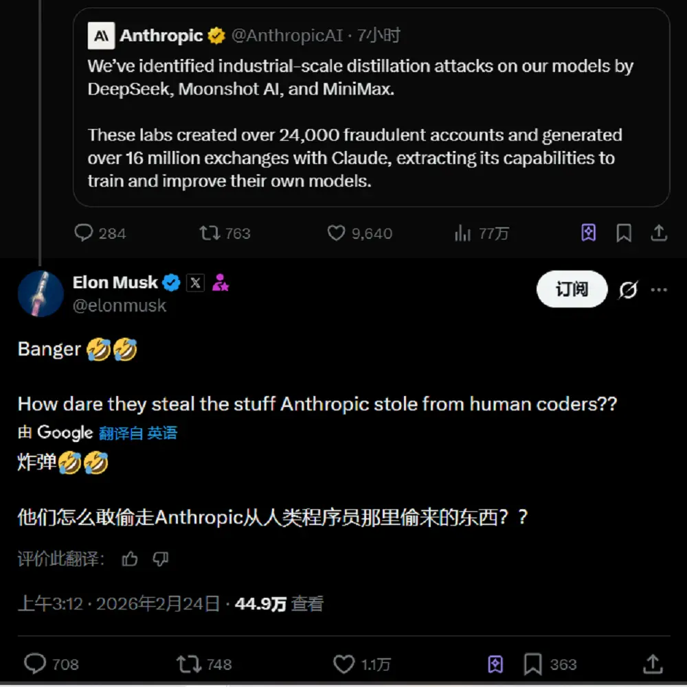 不少AI圈人士下场批评Anthropic,吐槽了Anthropic”只许州官放火,不许百姓点灯”的双标行为。马斯克第一时间反讽道:“绝了,他们(DeepSeek们)怎么敢偷Anthropic从人类程序员那里‘偷’来的东西?”