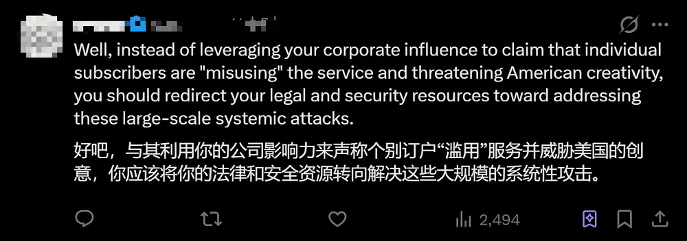 这位网友便认为,与其利用公司影响力来声称个别订户“滥用”服务并威胁美国的创意成果,Anthropic更应该做的是将自己的法律和安全资源转向解决这些大规模的系统性攻击。