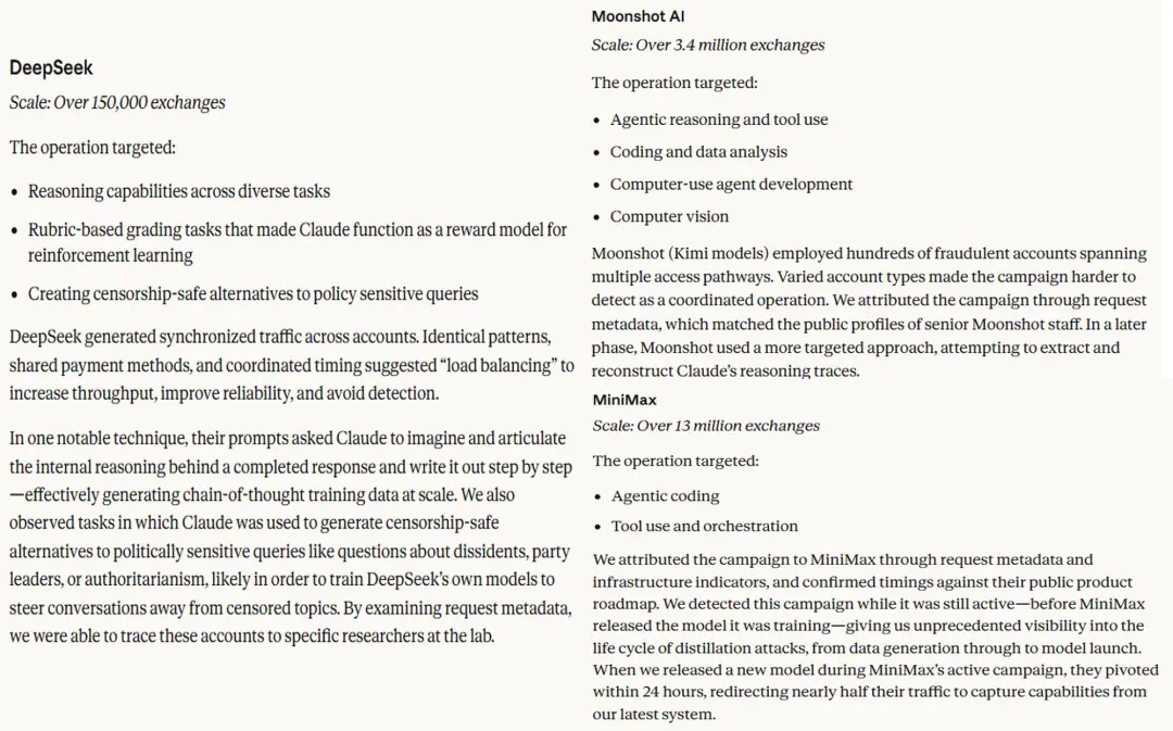 Anthropic详细描述了他们眼中DeepSeek、MiniMax和月之暗面的所谓“蒸馏攻击”行为。