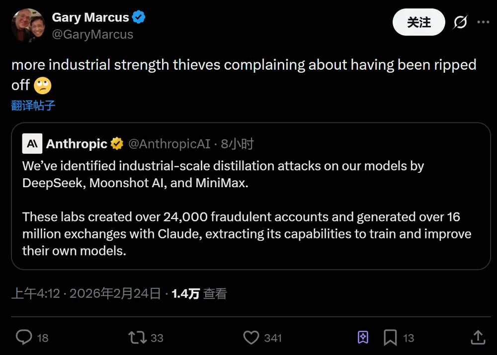 知名AI评论家Gary Marcus认为,Anthropic的行为是“肆无忌惮的盗贼抱怨自己被抢劫了”。