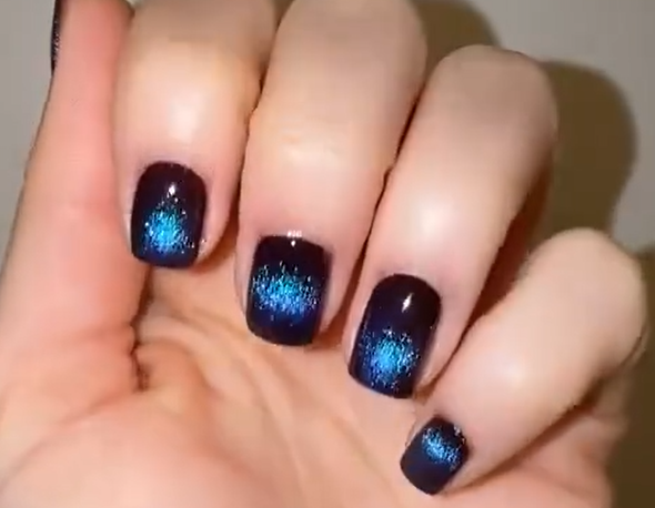 在磁场作用下,甲油中的金属颗粒会随之偏移。保持约一分钟,待甲油初步定型,即可获得一幅蓝黑渐变的美甲效果。用户Sarah Kendall也发布了全流程视频,证实该方法简单易行。