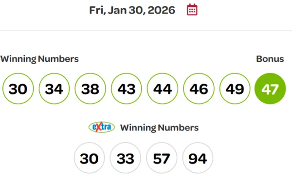 乐透Max彩票于1月30日星期五开奖,中奖号码为30、34、38、43、44、46和49,bonus号码为47。
