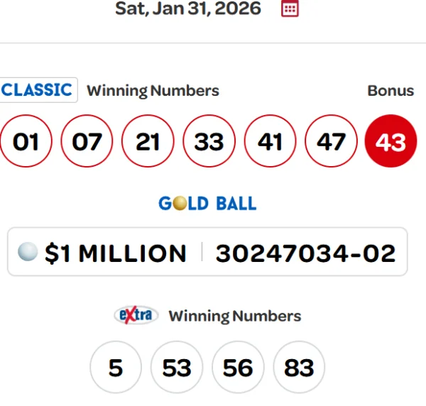 1月31日星期六,Lotto 6/49彩票开奖,经典组中奖号码为01、07、21、33、41和47,bonus号码为43。