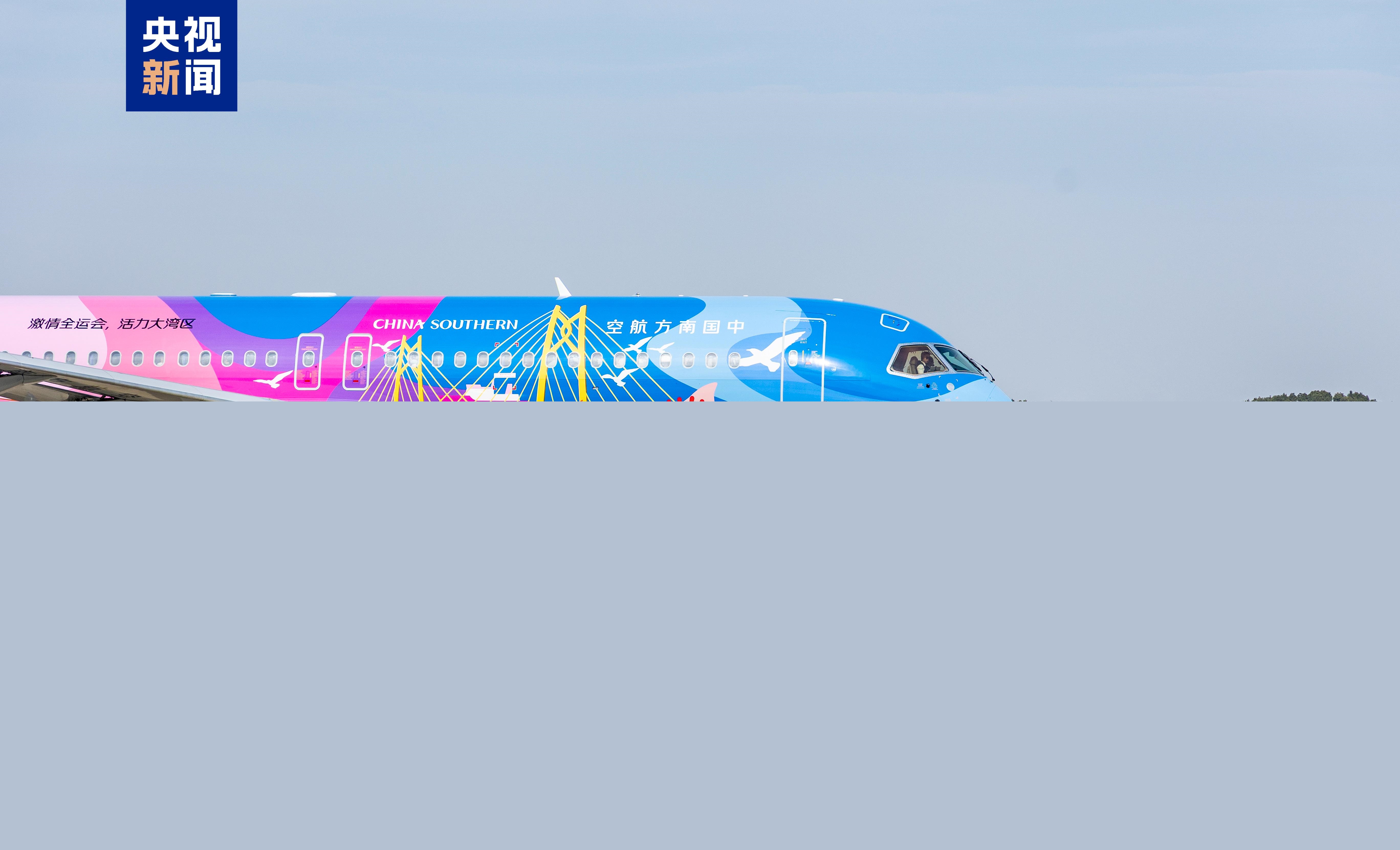 据悉,“大美湾区”号彩绘机是首架将国产大飞机C919和粤港澳大湾区、十五运会等主题元素深度融合的民航客机。