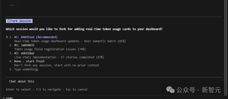 你只需要选一个最合适的会话,它就会直接给你一条fork命令,复制、粘贴到新的终端里。