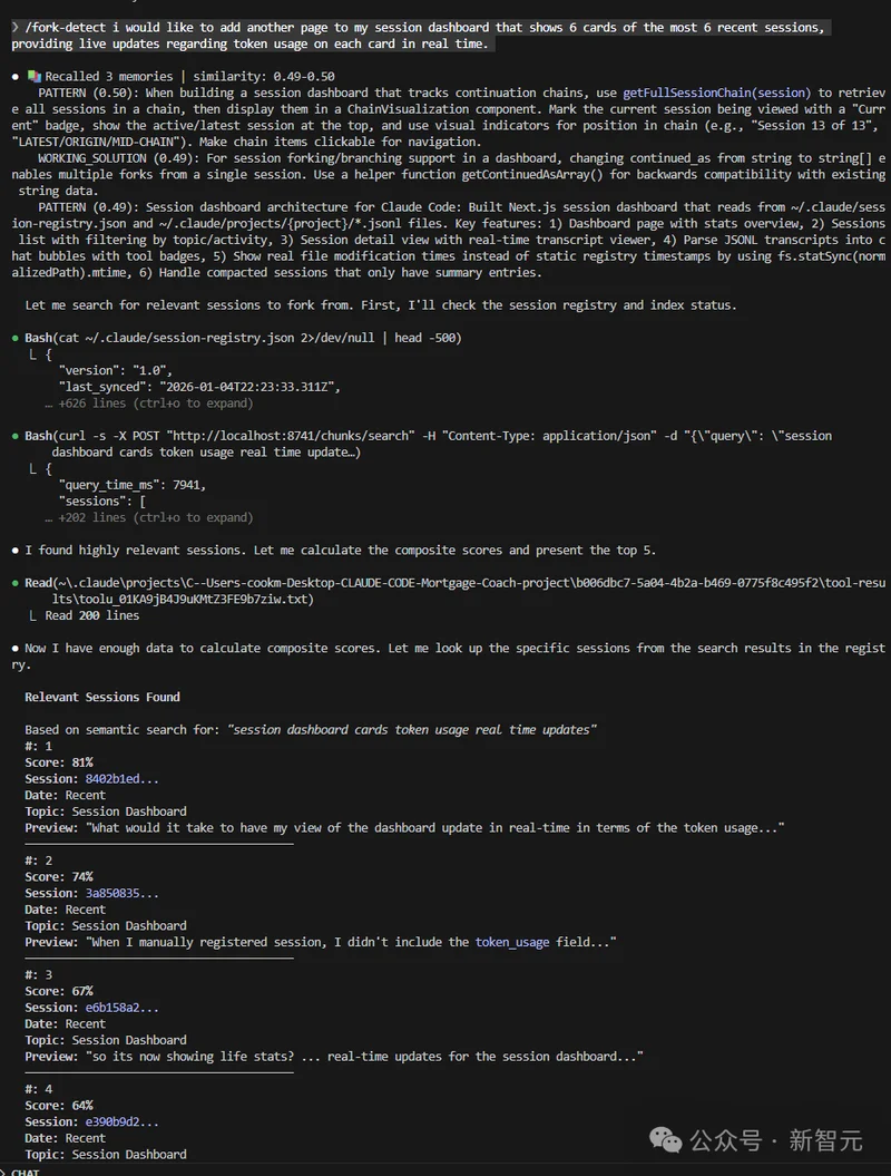 只需要调用 /fork-detect 命令,告诉它你现在想做什么,Claude就会把你的需求送进嵌入模型;然后,和一个包含你所有历史聊天记录的RAG向量数据库进行匹配(而且,这个数据库会随着你新的会话自动更新)。