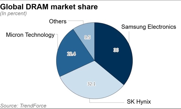 三星、SK海力士、美光三家公司占据了全球DRAM市场约九成份额,它们也是仅有的能够生产HBM芯片的半导体厂商。
