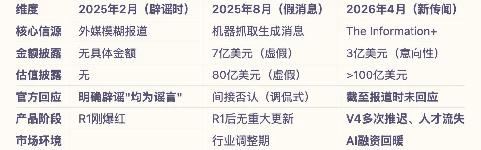 DeepSeek融资传闻并非首次出现,最早可追溯至2025年2月,当时的消息是“阿里巴巴等科技巨头被传表达投资兴趣”,DeepSeek明确回应“融资消息均为谣言”。