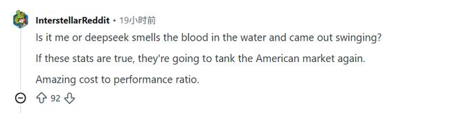 InterstellarReddit形容DeepSeek像是“闻到了水中的血腥味就立即出击了”(smelled blood in the water and struck immediately),认为其极致的性价比将再次重创美国AI市场。