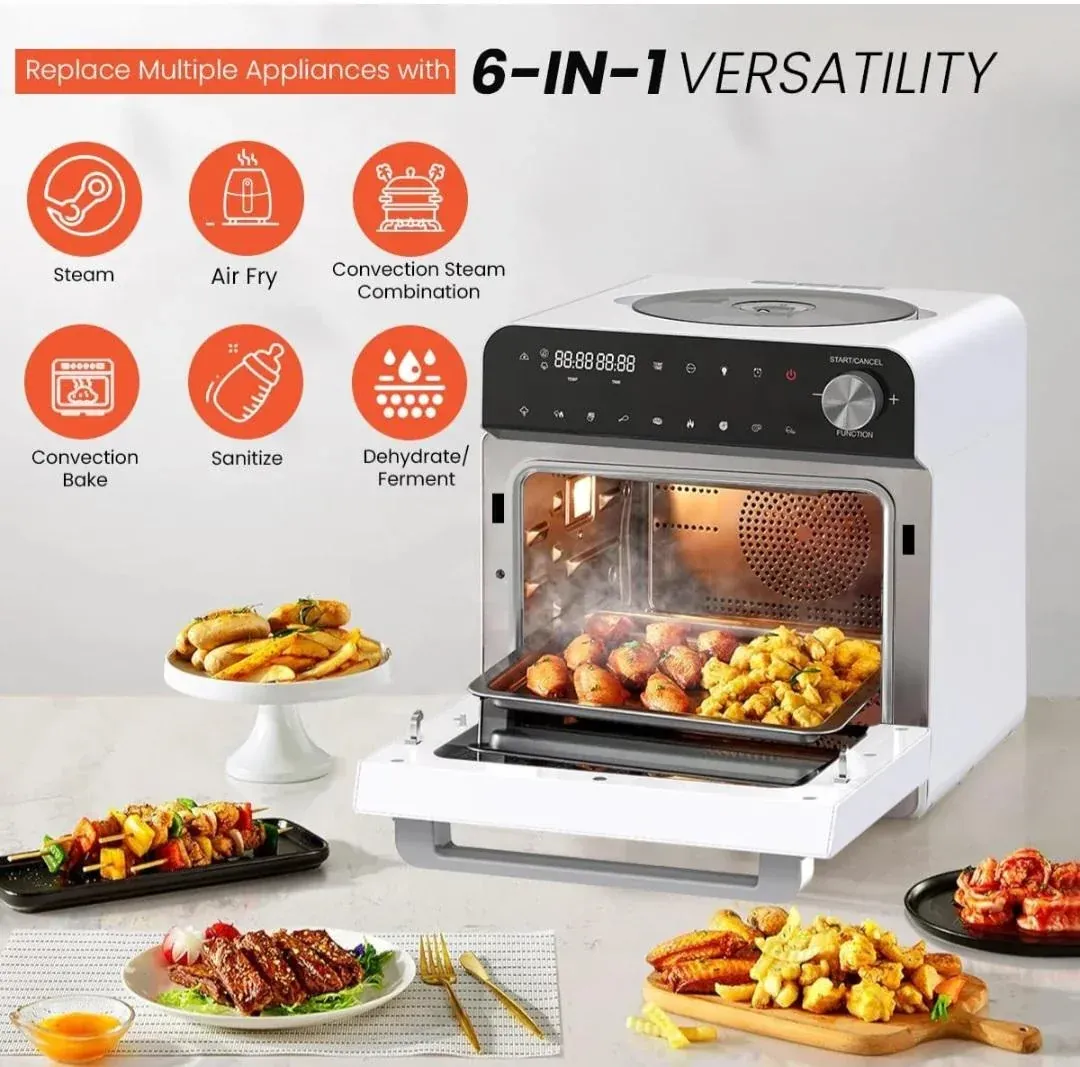 从页面信息来看,这是一款主打6合1的多功能厨房电器,集蒸汽、空气炸锅、蒸汽对流、对流烘烤、杀菌、脱水/发酵等功能于一体。其中蒸汽模式支持自清洁系统,宣称可通过高温蒸汽对不粘锅内胆进行杀菌、软化油渍,从而实现“轻松清洁”。