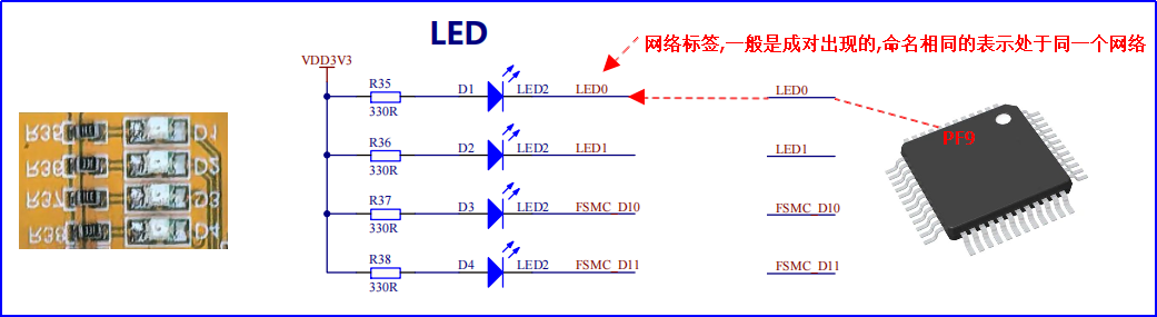 1、查看原理图,找到控制发光二极管的芯片的IO口,LED0 -- PF9引脚,其他的引脚类似!!