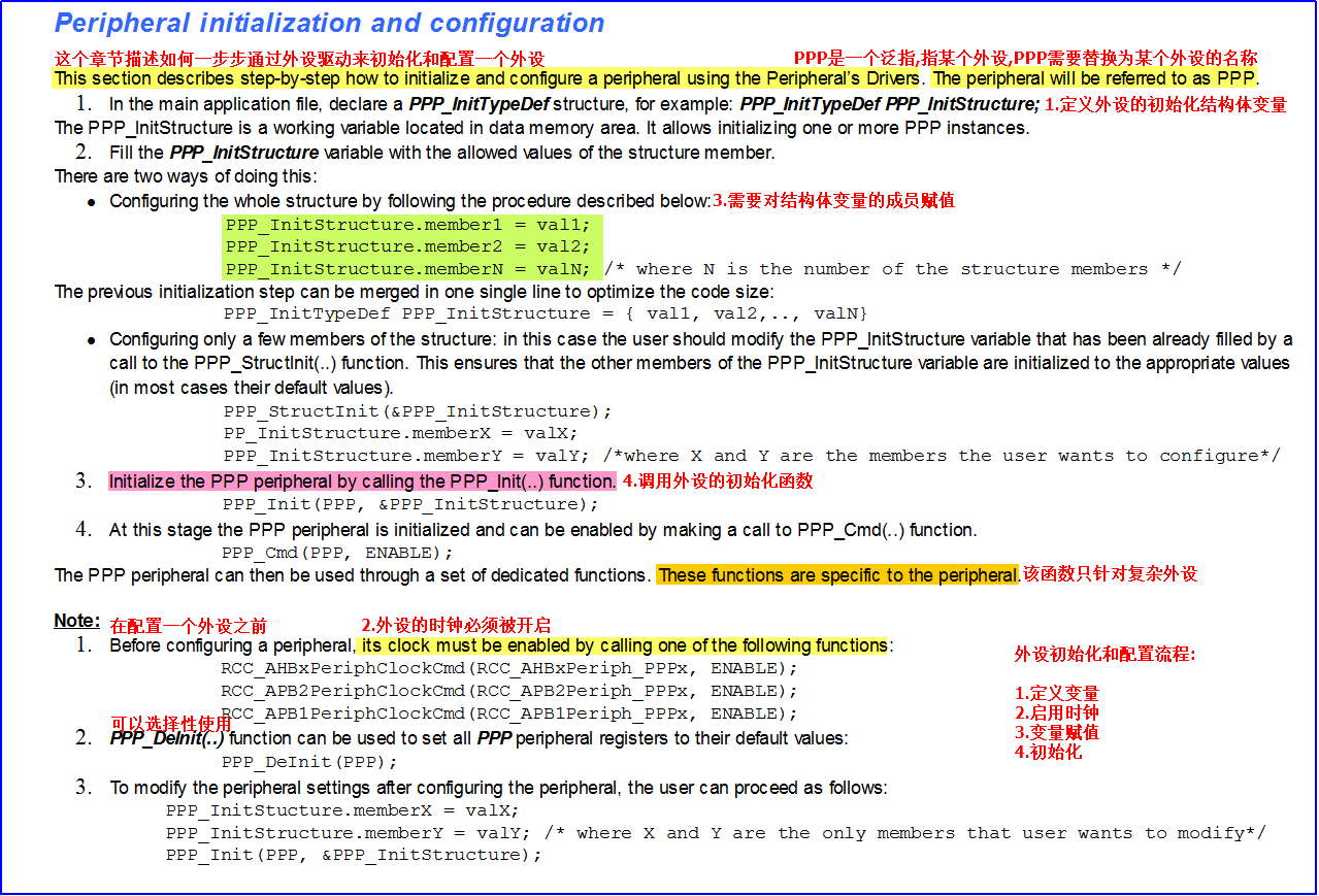 以上内容是ST公司官方提供的关于标准外设库(Standard Peripheral Library)的外设配置和初始化流程说明。这套流程涵盖了MCU(微控制器)中所有常见外设的配置方法,包括GPIO、USART、ADC、TIM等外设模块,具有很高的通用性和普适性。