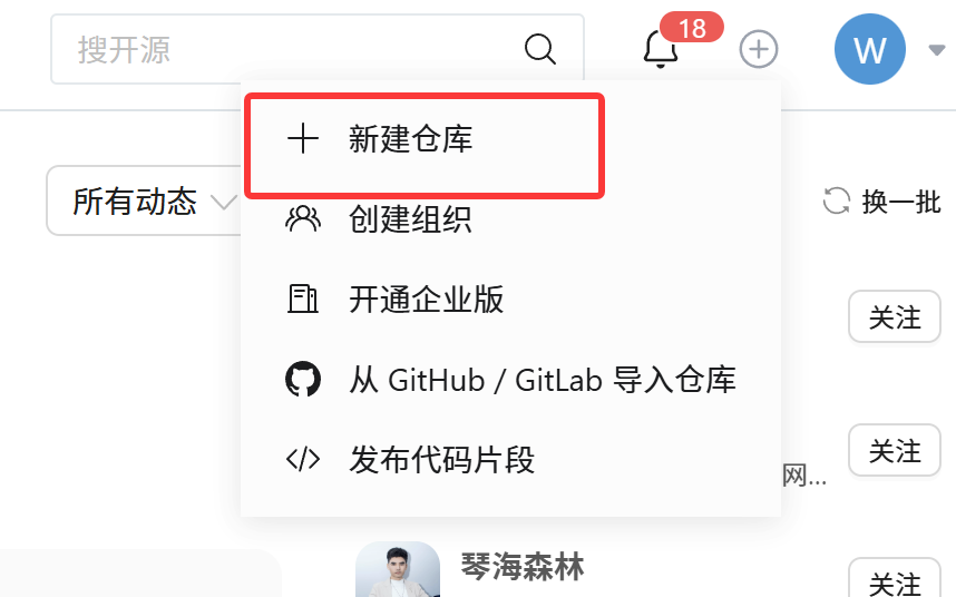 - 点击右上角 + → 新建仓库