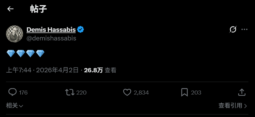 Gemma 4要发布的消息传了有段时间了,现在GoogleDeepmind创始人、CEO Demis Hassabis也发推暗示——他的内容是4颗钻石,而Gemma大模型的名称就是来自拉丁语宝石Gemma,因此这一暗示是非常明确了。