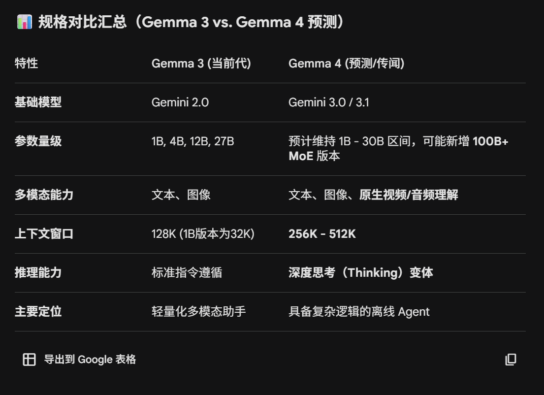 让Google自己的Gemini分析了下Gemma 4的能力预测,它给的答案很好很强大,甚至连深度思考能力也给了,上下文能力翻1-2倍,具备执行复杂逻辑能力。