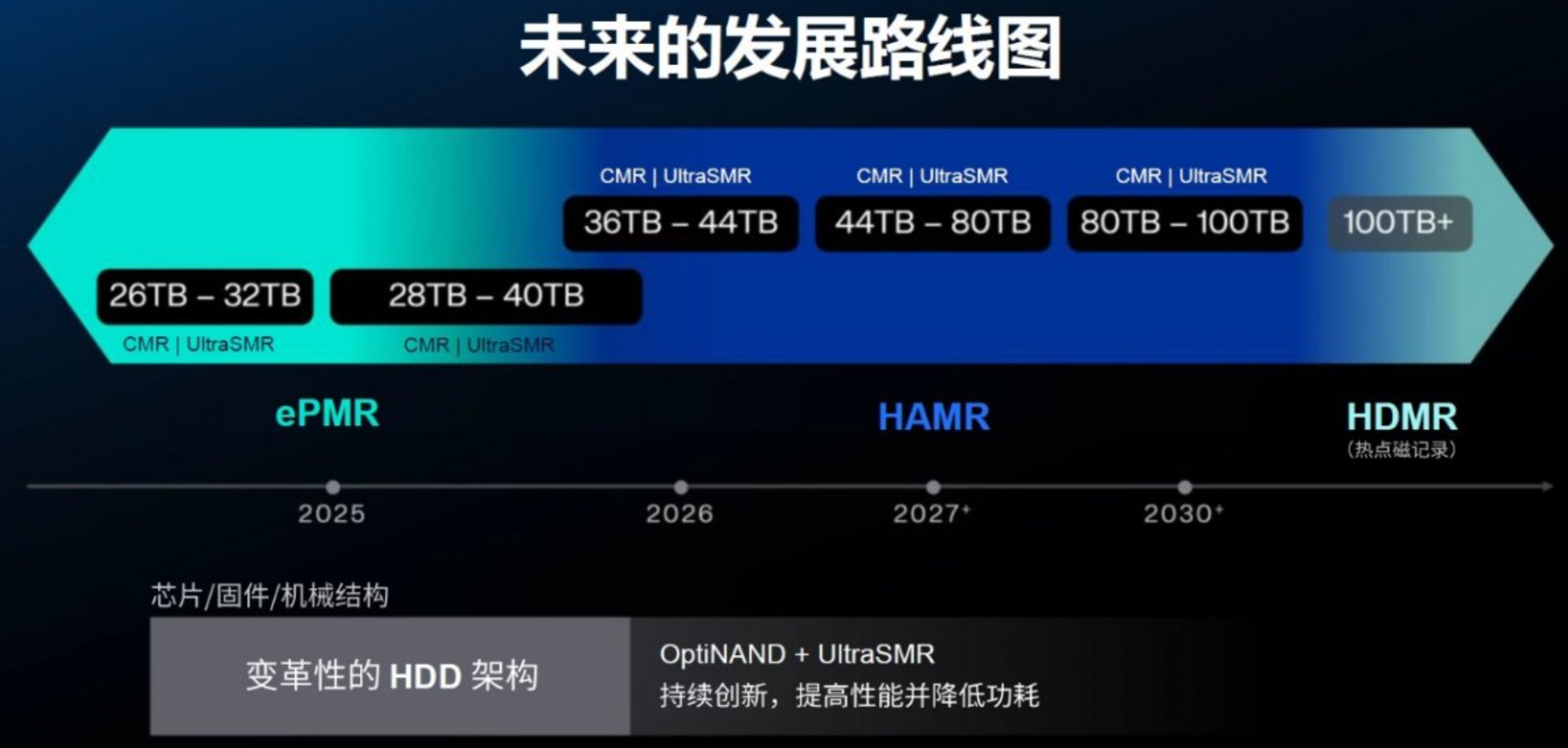 2030年的时间节点中,HAMR技术可以将容量继续推进到80TB到100TB,这个目标跟之前的变化不大。