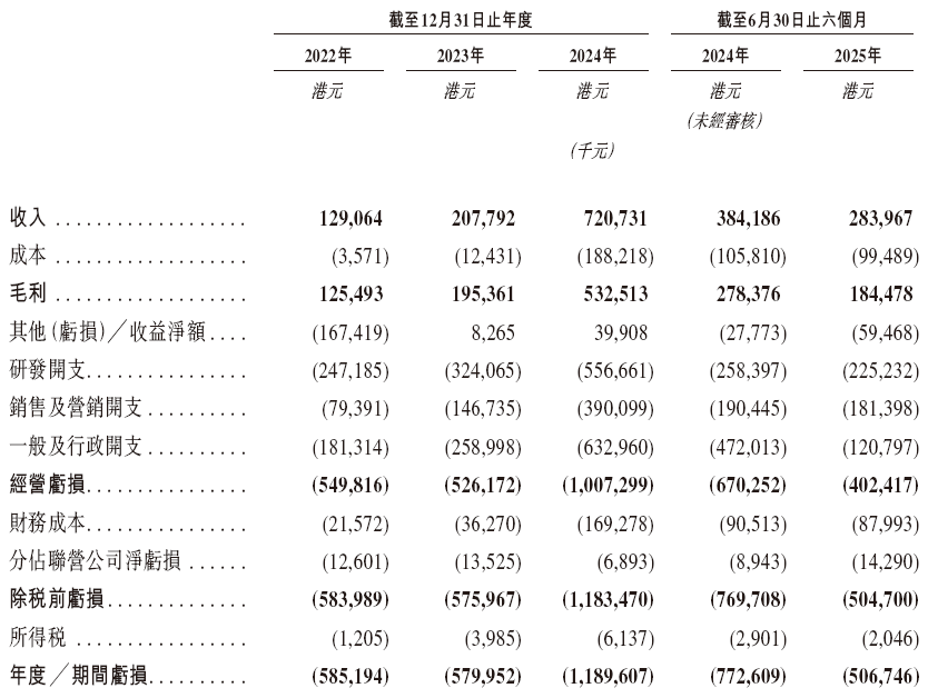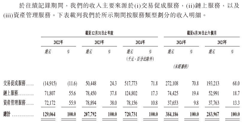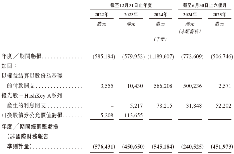 招股书显示,在过去的2022年、2023年、2024年和2025年前六个月,HashKey的营业收入分别为1.29亿、2.08亿、7.21亿和2.84亿港元,相应的净亏损分别为5.85亿、5.80亿、11.90亿和5.07亿港元,相应的经调整净亏损分别为5.76亿、4.51亿、5.45亿和4.52亿港元。