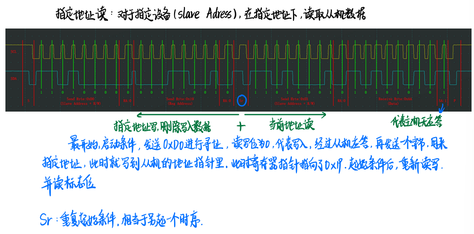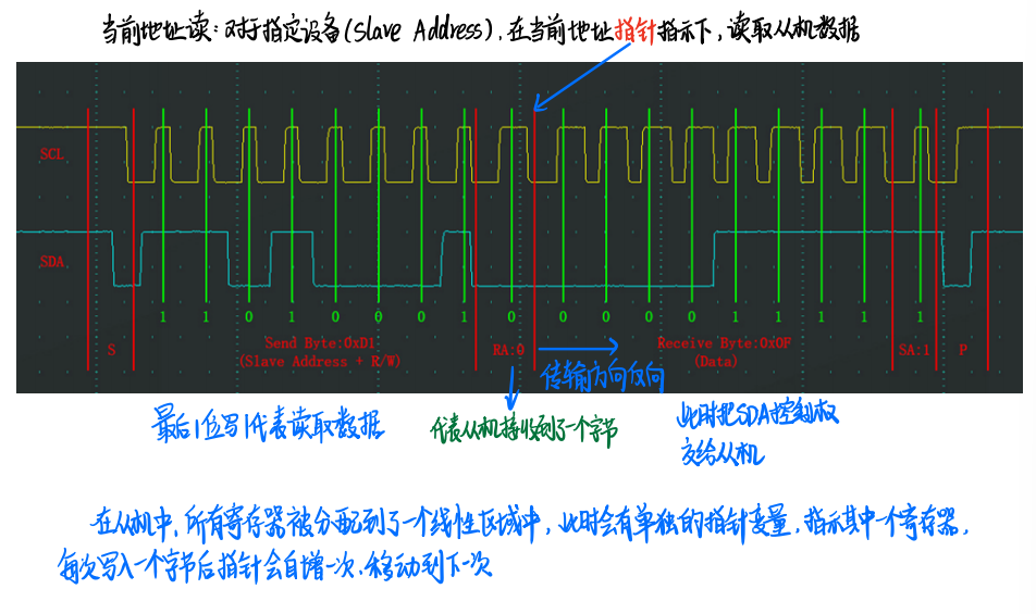 对于指定设备(Slave Address),在当前地址指针指示的地址下,读取从机数据(Data)