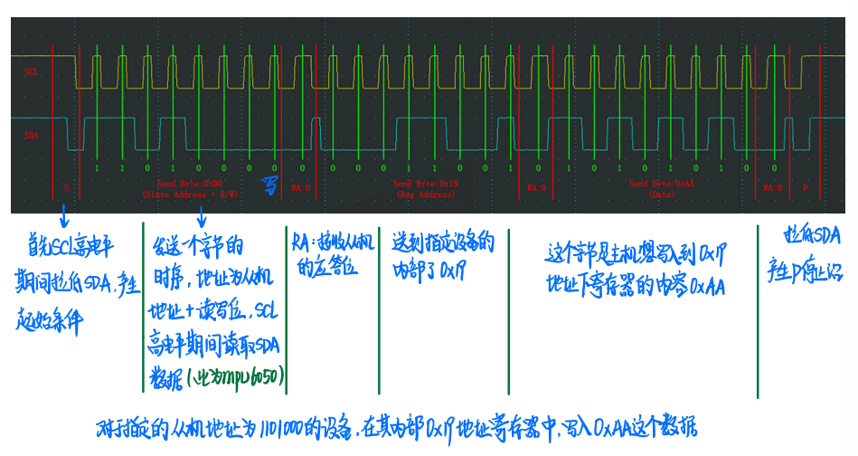 Tip:I2C发送数据是高位先行(看图),串口发送数据是低位先行