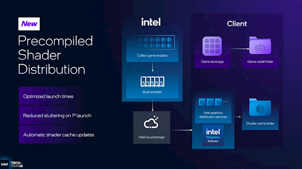 具体实现方式上,Intel首先通过云端提前分析游戏,并预编译着色器,并将其存在云端,再通过监测你玩的游戏,自动下载相应的预编译着色器,还会自动更新着色器缓存。