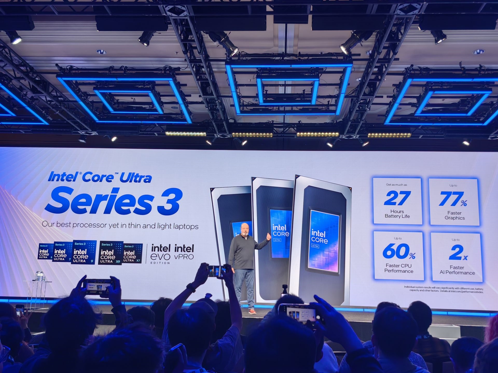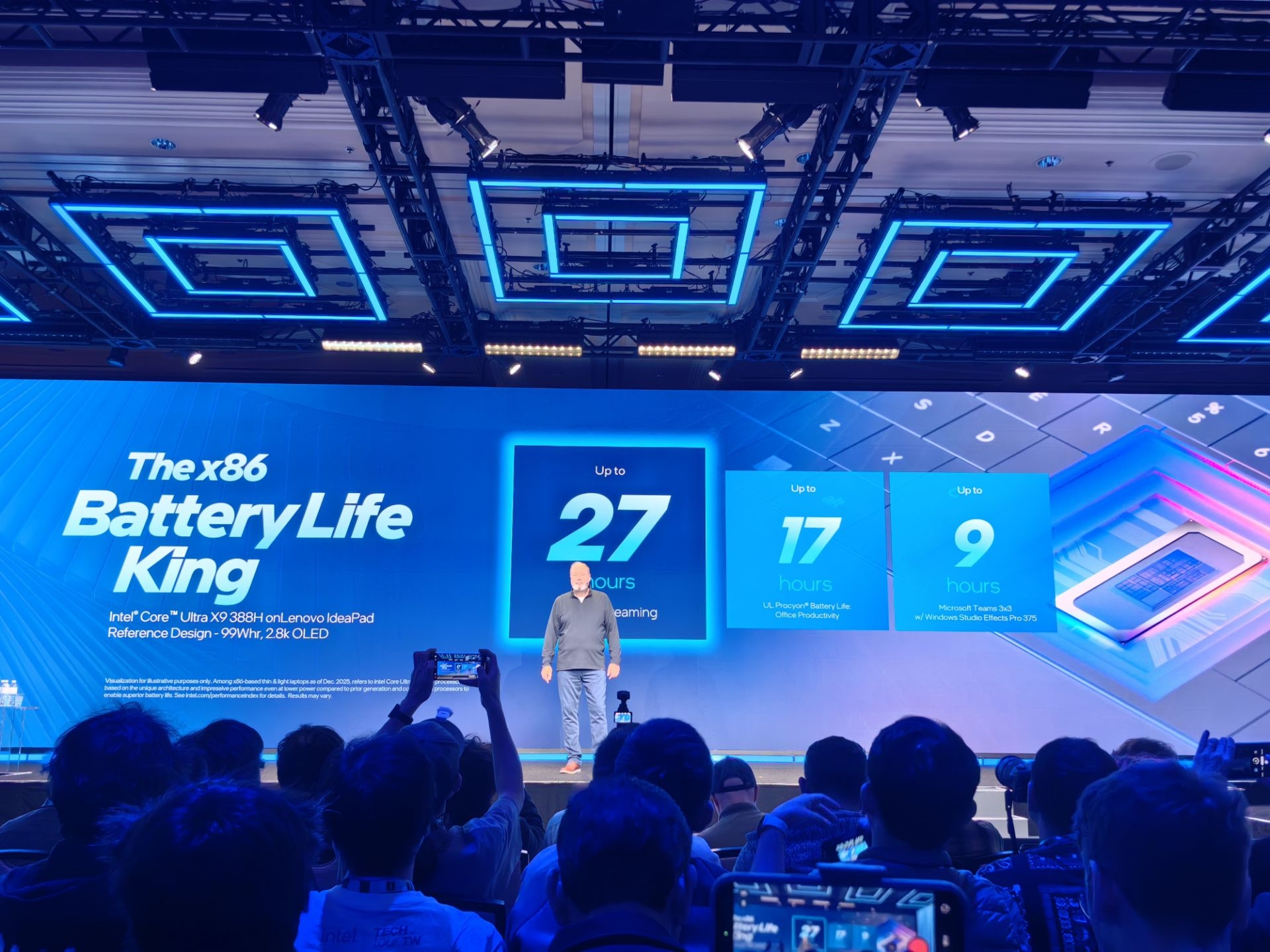对于其中最顶级的X9 388H,Intel宣称与Lunar Lake相比,其多线程性能提升高达60%,游戏性能提升高达 77%,AI性能提升两倍,电池续航时间更是可以长达27小时。