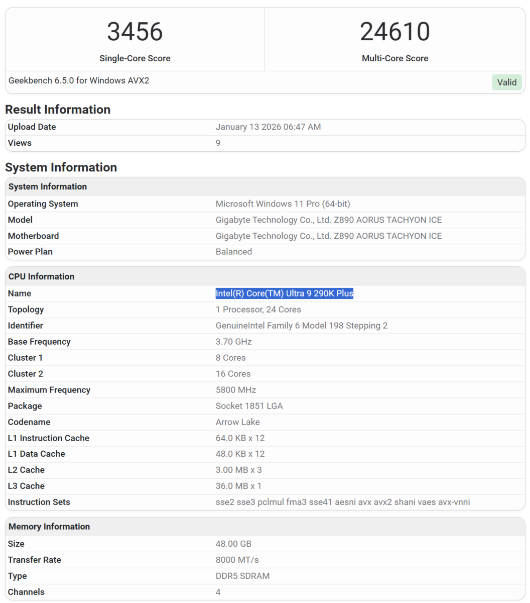 与285K相比,P核心的睿频增加100MHz,达到5.8GHz,在性能测试中,酷睿Ultra 9 290K Plus单线程测试3456分,多核测试24610分,单核性能提升7%,多核性能提升9%。