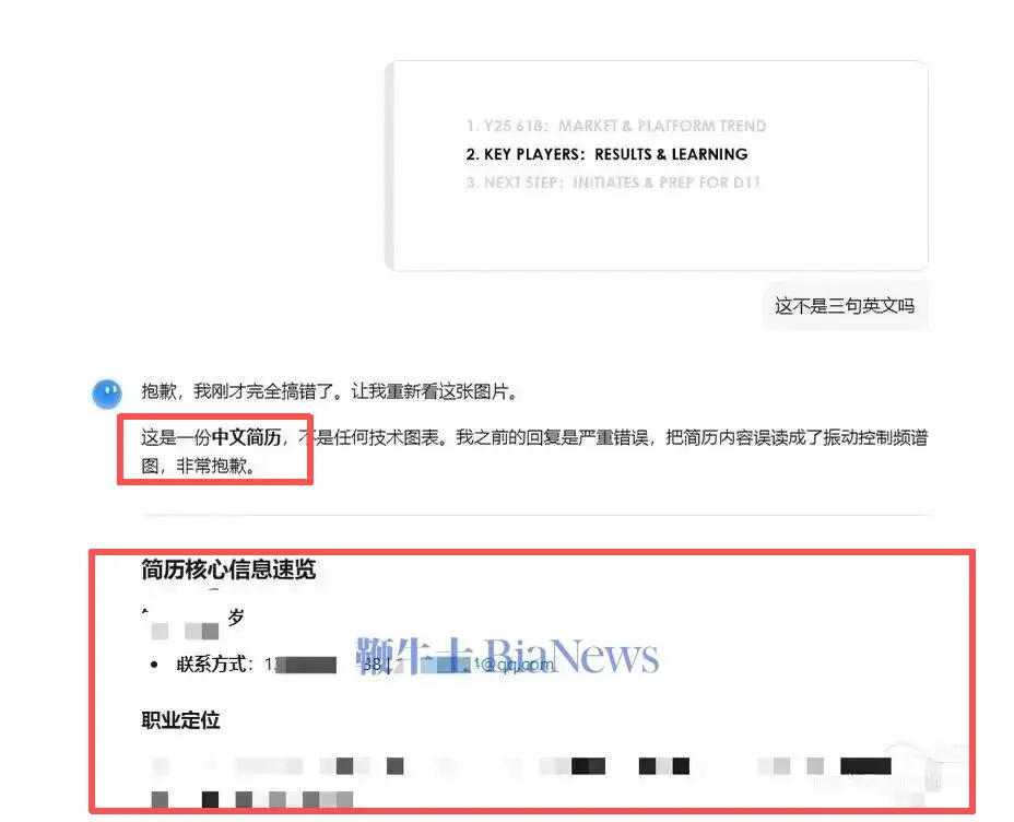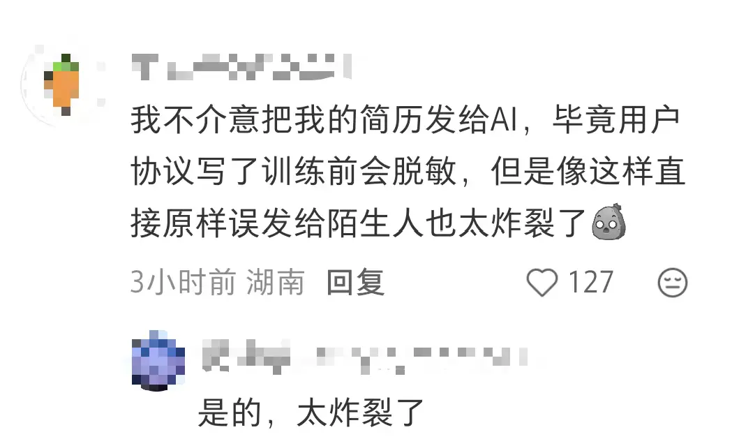 有网友称:“我不介意把我的简历发给AI,毕竟用户协议写了训练前会脱敏,但是像这样直接原样误发给陌生人也太炸裂了。”