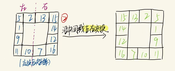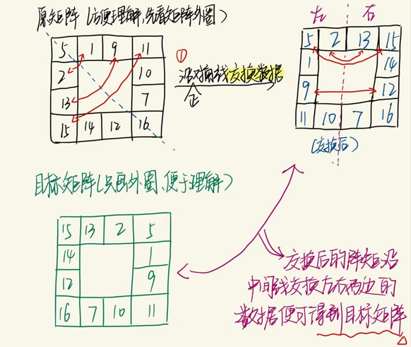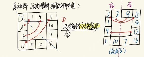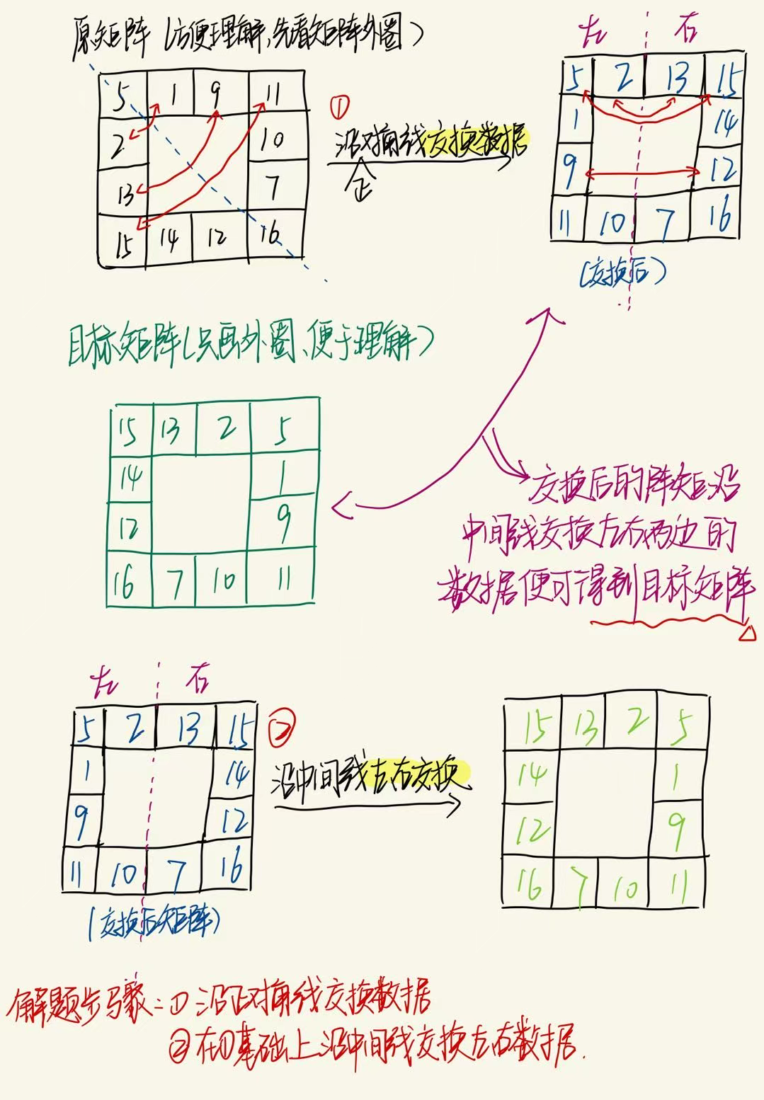 如上图将上下区域的数据进行交换后,原矩阵外圈中顶部这一行的数据原本顺时针移动后应该去到外圈的右边这一列,原矩阵外圈左边这一列顺时针旋转后应该去到顶部这一行。但是当我们沿对角线交换数据后,原矩阵外圈顶部数据,被移动到了左边这一列,原矩阵左边这一列被移动到了外圈顶部。(原矩阵右边这一列和底部这一行沿正对角线交换后的问题原理同上)现在解决本道题转化为下面两个问题