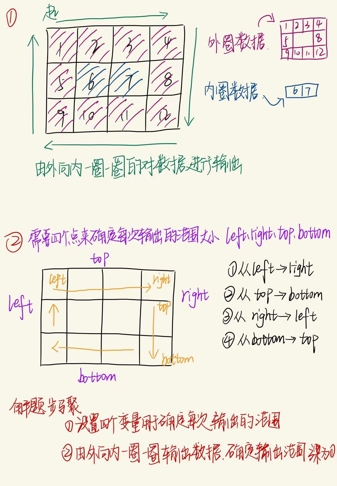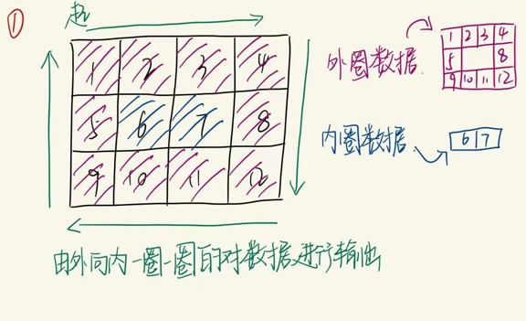 举个例子:按照顺时针,①首先需要获取第一行的数据,循环的输写应该是