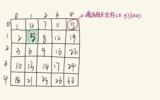 看到本题我相信各位小伙伴脑子里肯定已经有了第一个解题方法---遍历整个二维数组。但是题目说编写一个高效的方法来解决本题,这里我们不采取直接遍历整个二维数组的方法。由题目已知这个二位数组的特点,每行从左到右数字增大,每列从上到下数字增大。倘若现在遍历的起始点如下图所示