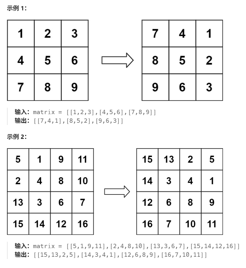 要求:你必须在 原地 旋转图像,这意味着你需要直接修改输入的二维矩阵。请不要 使用另一个矩阵来旋转图像。