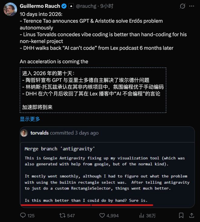 “猜猜2026年谁在氛围编程……是Linus Torvalds,在用Google的Antigravity。这下没戏了(It's over)。”
