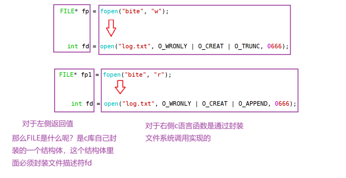 - 作用: fopen/fclose/fread/fwrite 这些C库函数,底层是通过 FILE* 里封装的 fd ,间接调用内核的文件操作接口(比如 open/read/write/close 系统调用),进而操作内核中的 struct file 。