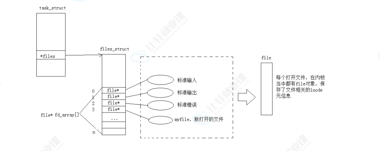 后续你操作 myfile 时,只需要通过 fd=3 (数组下标),就能从 fd_array 找到对应的 struct file ,再基于这个结构体操作文件的实际内容。