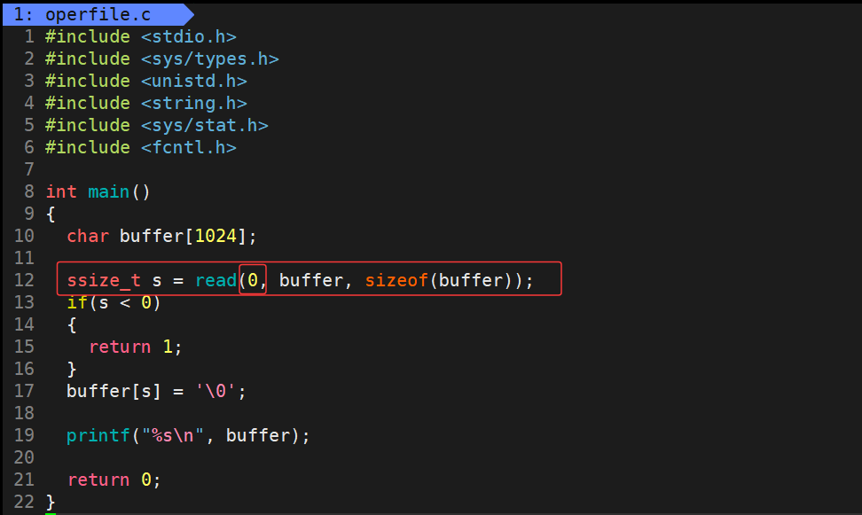 此时数据就被read将数据读取进buffer字符数组内了,由于文件中并没有对于字符串以\0结尾的规定,由于我们使用的是C语言,c语言在内存中无法区分出字符串,所以要在字符串的结尾处添加\0作为字符串结尾的标志,此时字符串才可以正常被打印出来,需要注意的是,最后输入的换行符同样会被当作有效字符读取,所以也会被读取,所以才会出现两个换行
