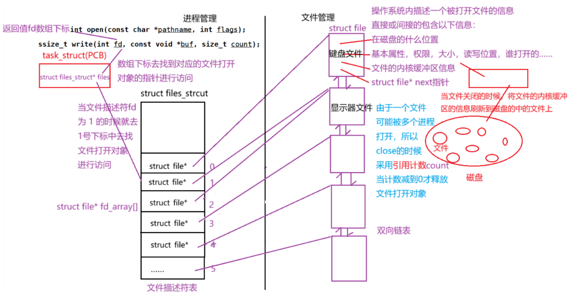 整个流程的核心是:进程通过“文件描述符表的数组下标(fd)”,关联到内核中代表文件的 struct file ,最终实现对文件的管理。