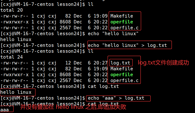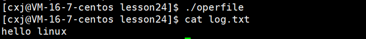 可以看出 /home/cxj/116_117 这个上级路径中已经有了 log.txt 文件,也就说明了若未指定文件绝对路径,系统会自动将进程的cwd与文件名拼接,作为文件创建路径。