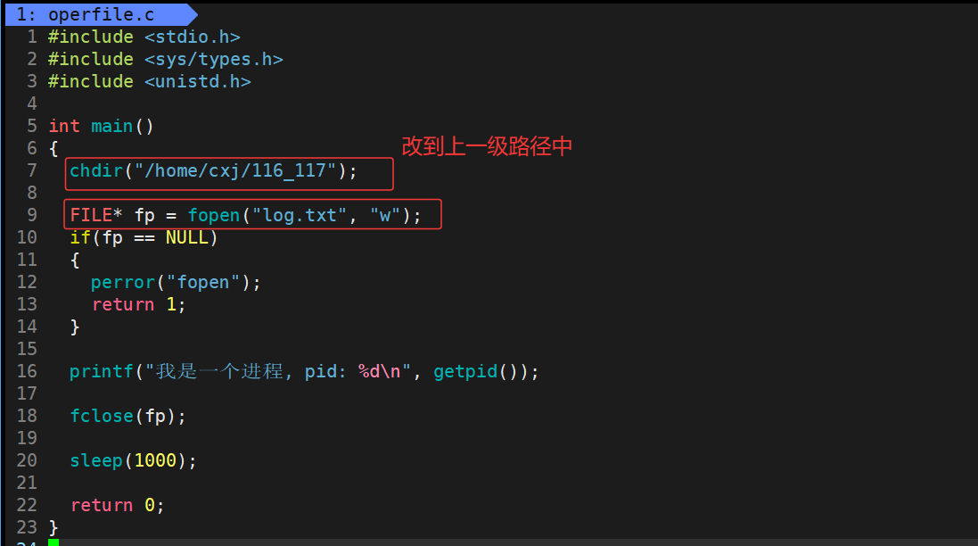 同样的,在上面代码的基础上,打印出当前进程的pid,并且关闭文件之后让进程休眠1000秒,便于我们查看进程的当前工作目录