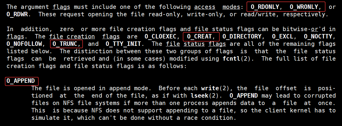 标志位 flag 实际上是由多个预定义的宏通过位运算组合而成的,这些宏定义在 <fcntl.h> 头文件中。我们可以使用按位或运算符 | 来组合多个标志位,原理我们已经在比特位方式传递标志位中讲解过了,下面使用红色框框出来的是我们比较常用的一些标志位