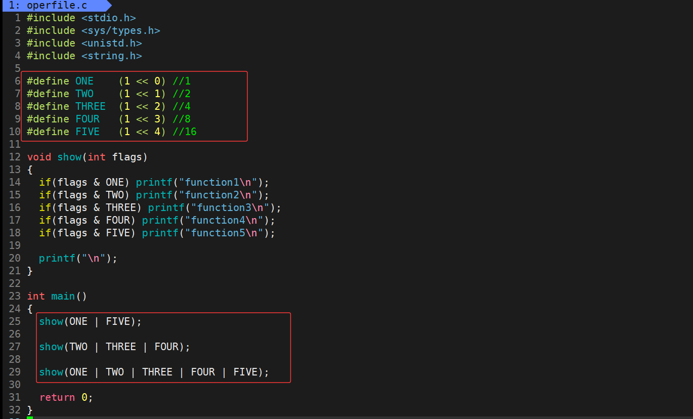 - 给每个功能分配“唯一二进制位” : 通过 1 << n (左移运算),让每个宏对应一个“只有某一位是1”的二进制数(比如 ONE=00001 、 FIVE=10000 ),确保每个宏的标识不重叠。